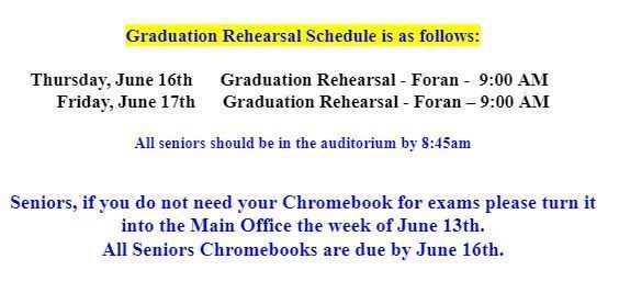Graduation is set for Friday, June 17th at 5:15pm. As in past years, students will be required to pay $40 to cover the costs of graduation expenses, which includes cap, gown, and diploma cover.
